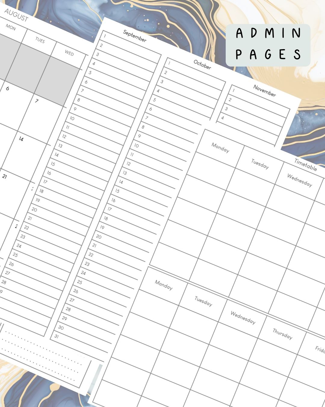 I mean, it’s what it says on the tin. In this section you’ll find space for your timetable, a yearly perpetual calendar that you can use however you like! Think student birthdays, habit tracking ect, as well as monthly planner pages with space to block out key dates and deadlines